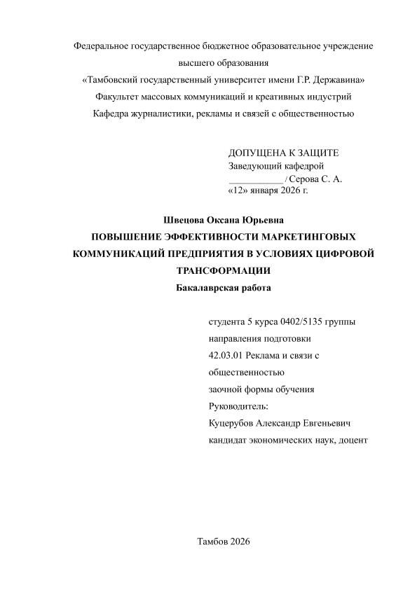 ШВЕЦОВА, ОКСАНА ЮРЬЕВНА. ПОВЫШЕНИЕ ЭФФЕКТИВНОСТИ МАРКЕТИНГОВЫХ КОММУНИКАЦИЙ ПРЕДПРИЯТИЯ В УСЛОВИЯХ ЦИФРОВОЙ ТРАНСФОРМАЦИИ [Электронный ресурс]: бакалаврская работа: 42.03.01 Реклама и связи с общественностью: Заочная форма обучения / О. Ю. ШВЕЦОВА; ТГУ им. Г. Р. Державина ; науч. рук. к. э. н., доцент, А. Е. Куцерубов. — Электрон. текстовые дан. (1 файл). — Тамбов, 2026. — Загл. с титул. экрана. — <URL:https://elibrary.tsutmb.ru/dl/docs/vkr18892.pdf>.