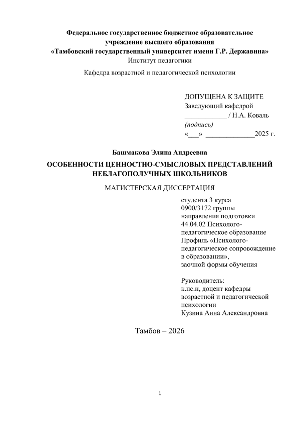 БАШМАКОВА, ЭЛИНА АНДРЕЕВНА. ОСОБЕННОСТИ ЦЕННОСТНО-СМЫСЛОВЫХ ПРЕДСТАВЛЕНИЙ НЕБЛАГОПОЛУЧНЫХ ШКОЛЬНИКОВ [Электронный ресурс]: магистерская диссертация: 44.04.02 Психолого-педагогическое образование: Психолого-педагогическое сопровождение в образовании: Заочная форма обучения / Э. А. БАШМАКОВА; ТГУ им. Г. Р. Державина ; науч. рук. к. пед. н., доцент, А. А. Кузина. — Электрон. текстовые дан. (1 файл). — Тамбов, 2025. — Загл. с титул. экрана. — <URL:https://elibrary.tsutmb.ru/dl/docs/vkr18893.pdf>.