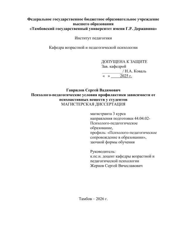 ГАВРИЛОВ, СЕРГЕЙ ВАДИМОВИЧ. ПСИХОЛОГО-ПЕДАГОГИЧЕСКИЕ УСЛОВИЯ ПРОФИЛАКТИКИ ЗАВИСИМОСТИ ОТ ПСИХОАКТИВНЫХ ВЕЩЕСТВ У СТУДЕНТОВ [Электронный ресурс]: магистерская диссертация: 44.04.02 Психолого-педагогическое образование: Психолого-педагогическое сопровождение в образовании: Заочная форма обучения / С. В. ГАВРИЛОВ; ТГУ им. Г. Р. Державина ; науч. рук. к. п. н., доцент, С. В. Жернов. — Электрон. текстовые дан. (1 файл). — Тамбов, 2025. — Загл. с титул. экрана. — <URL:https://elibrary.tsutmb.ru/dl/docs/vkr18894.pdf>.