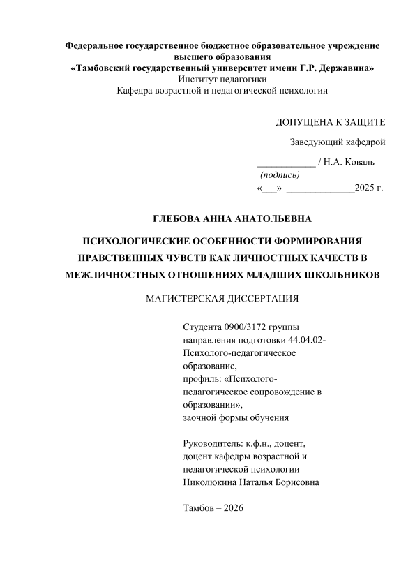 ГЛЕБОВА, АННА АНАТОЛЬЕВНА. ПСИХОЛОГИЧЕСКИЕ ОСОБЕННОСТИ ФОРМИРОВАНИЯ НРАВСТВЕННЫХ ЧУВСТВ КАК ЛИЧНОСТНЫХ КАЧЕСТВ В МЕЖЛИЧНОСТНЫХ ОТНОШЕНИЯХ МЛАДШИХ ШКОЛЬНИКОВ [Электронный ресурс]: магистерская диссертация: 44.04.02 Психолого-педагогическое образование: Психолого-педагогическое сопровождение в образовании: Заочная форма обучения / А. А. ГЛЕБОВА; ТГУ им. Г. Р. Державина ; науч. рук. к. филос. н., доцент, Н. Б. Николюкина. — Электрон. текстовые дан. (1 файл). — Тамбов, 2025. — Загл. с титул. экрана. — <URL:https://elibrary.tsutmb.ru/dl/docs/vkr18895.pdf>.
