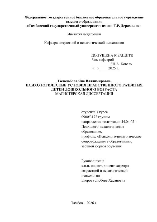 ГОЛОЛОБОВА, ЯНА ВЛАДИМИРОВНА. ПСИХОЛОГИЧЕСКИЕ УСЛОВИЯ НРАВСТВЕННОГО РАЗВИТИЯ ДЕТЕЙ ДОШКОЛЬНОГО ВОЗРАСТА [Электронный ресурс]: магистерская диссертация: 44.04.02 Психолого-педагогическое образование: Психолого-педагогическое сопровождение в образовании: Заочная форма обучения / Я. В. ГОЛОЛОБОВА; ТГУ им. Г. Р. Державина ; науч. рук. к. пед. н., доцент, Л. Х. Егорова. — Электрон. текстовые дан. (1 файл). — Тамбов, 2025. — Загл. с титул. экрана. — <URL:https://elibrary.tsutmb.ru/dl/docs/vkr18896.pdf>.