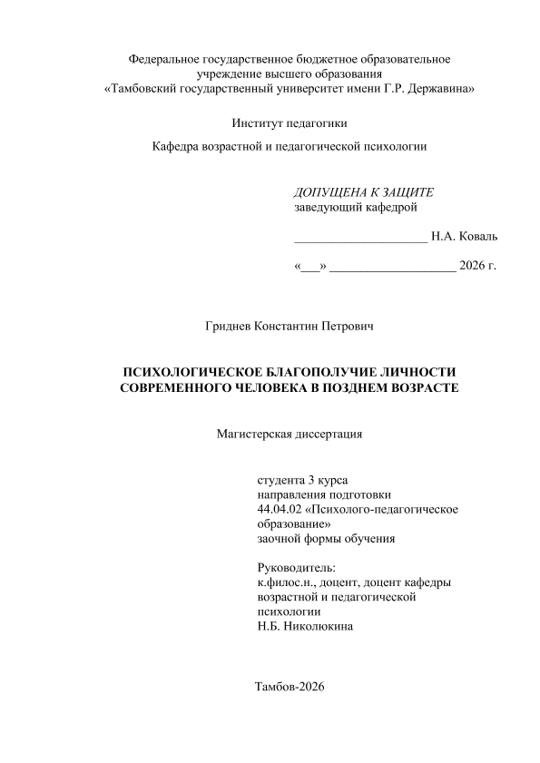 ГРИДНЕВ, КОНСТАНТИН ПЕТРОВИЧ. ПСИХОЛОГИЧЕСКОЕ БЛАГОПОЛУЧИЕ ЛИЧНОСТИ СОВРЕМЕННОГО ЧЕЛОВЕКА В ПОЗДНЕМ ВОЗРАСТЕ [Электронный ресурс]: магистерская диссертация: 44.04.02 Психолого-педагогическое образование: Психолого-педагогическое сопровождение в образовании: Заочная форма обучения / К. П. ГРИДНЕВ; ТГУ им. Г. Р. Державина ; науч. рук. к. филос. н., доцент, Н. Б. Николюкина. — Электрон. текстовые дан. (1 файл). — Тамбов, 2025. — Загл. с титул. экрана. — <URL:https://elibrary.tsutmb.ru/dl/docs/vkr18897.pdf>.