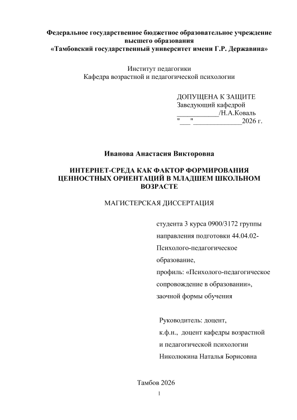 ИВАНОВА, АНАСТАСИЯ ВИКТОРОВНА. ИНТЕРНЕТ-СРЕДА КАК ФАКТОР ФОРМИРОВАНИЯ ЦЕННОСТНЫХ ОРИЕНТАЦИЙ В МЛАДШЕМ ШКОЛЬНОМ ВОЗРАСТЕ [Электронный ресурс]: магистерская диссертация: 44.04.02 Психолого-педагогическое образование: Психолого-педагогическое сопровождение в образовании: Заочная форма обучения / А. В. ИВАНОВА; ТГУ им. Г. Р. Державина ; науч. рук. к. филос. н., доцент, Н. Б. Николюкина. — Электрон. текстовые дан. (1 файл). — Тамбов, 2025. — Загл. с титул. экрана. — <URL:https://elibrary.tsutmb.ru/dl/docs/vkr18898.pdf>.