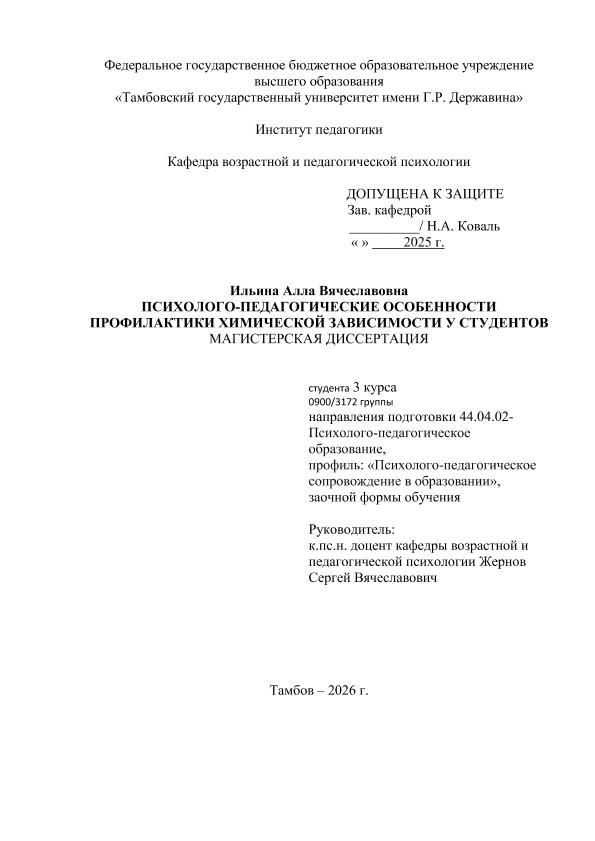 ИЛЬИНА, АЛЛА ВЯЧЕСЛАВОВНА. ПСИХОЛОГО-ПЕДАГОГИЧЕСКИЕ ОСОБЕННОСТИ ПРОФИЛАКТИКИ ХИМИЧЕСКОЙ ЗАВИСИМОСТИ У СТУДЕНТОВ [Электронный ресурс]: магистерская диссертация: 44.04.02 Психолого-педагогическое образование: Психолого-педагогическое сопровождение в образовании: Заочная форма обучения / А. В. ИЛЬИНА; ТГУ им. Г. Р. Державина ; науч. рук. к. п. н., доцент, С. В. Жернов. — Электрон. текстовые дан. (1 файл). — Тамбов, 2025. — Загл. с титул. экрана. — <URL:https://elibrary.tsutmb.ru/dl/docs/vkr18899.pdf>.