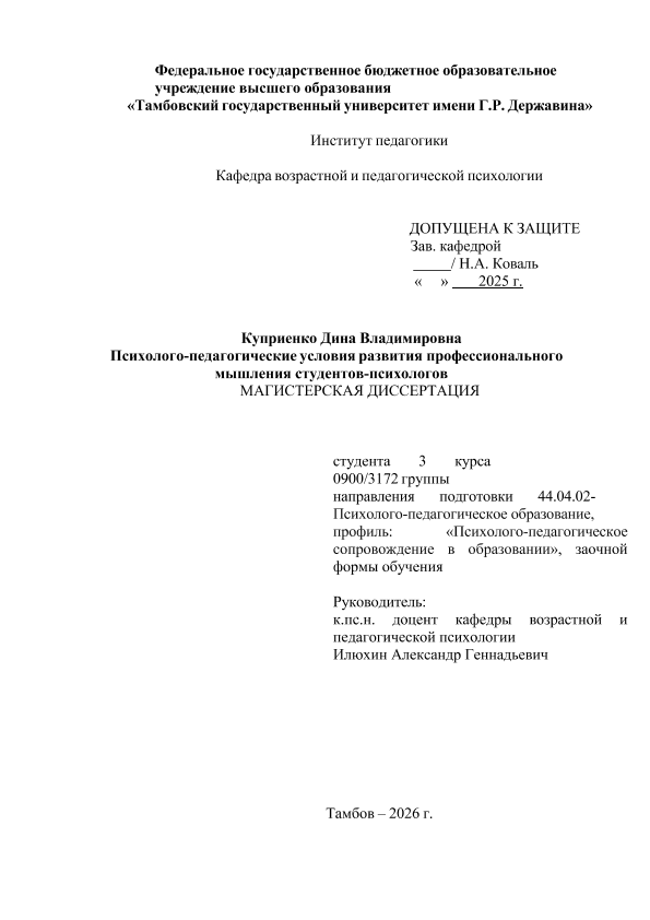 КУПРИЕНКО, ДИНА ВЛАДИМИРОВНА. ПСИХОЛОГО-ПЕДАГОГИЧЕСКИЕ УСЛОВИЯ РАЗВИТИЯ ПРОФЕССИОНАЛЬНОГО МЫШЛЕНИЯ СТУДЕНТОВ-ПСИХОЛОГОВ [Электронный ресурс]: магистерская диссертация: 44.04.02 Психолого-педагогическое образование: Психолого-педагогическое сопровождение в образовании: Заочная форма обучения / Д. В. КУПРИЕНКО; ТГУ им. Г. Р. Державина ; науч. рук. к. п. н., доцент, А. Г. Илюхин. — Электрон. текстовые дан. (1 файл). — Тамбов, 2025. — Загл. с титул. экрана. — <URL:https://elibrary.tsutmb.ru/dl/docs/vkr18901.pdf>.