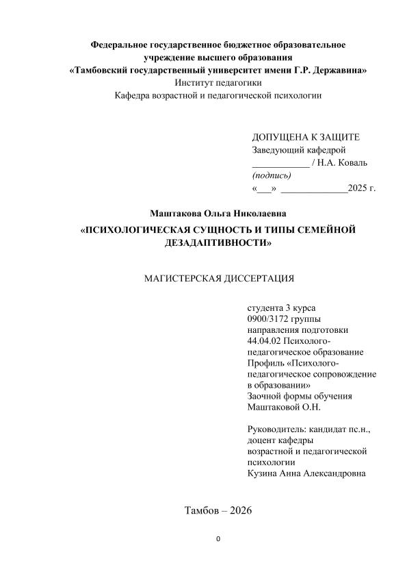 МАШТАКОВА, ОЛЬГА НИКОЛАЕВНА. ПСИХОЛОГИЧЕСКАЯ СУЩНОСТЬ И ТИПЫ СЕМЕЙНОЙ ДЕЗАДАПТИВНОСТИ [Электронный ресурс]: магистерская диссертация: 44.04.02 Психолого-педагогическое образование: Психолого-педагогическое сопровождение в образовании: Заочная форма обучения / О. Н. МАШТАКОВА; ТГУ им. Г. Р. Державина ; науч. рук. к. пед. н., доцент, А. А. Кузина. — Электрон. текстовые дан. (1 файл). — Тамбов, 2025. — Загл. с титул. экрана. — <URL:https://elibrary.tsutmb.ru/dl/docs/vkr18902.pdf>.