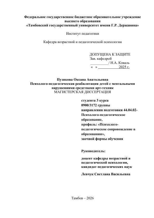 ПУЗИКОВА, ОКСАНА АНАТОЛЬЕВНА. ПСИХОЛОГО-ПЕДАГОГИЧЕСКАЯ РЕАБИЛИТАЦИЯ ДЕТЕЙ С МЕНТАЛЬНЫМИ НАРУШЕНИЯМИ СРЕДСТВАМИ АРТ-ТЕХНИК [Электронный ресурс]: магистерская диссертация: 44.04.02 Психолого-педагогическое образование: Психолого-педагогическое сопровождение в образовании: Заочная форма обучения / О. А. ПУЗИКОВА; ТГУ им. Г. Р. Державина ; науч. рук. к. пед. н., доцент, С. В. Левчук. — Электрон. текстовые дан. (1 файл). — Тамбов, 2025. — Загл. с титул. экрана. — <URL:https://elibrary.tsutmb.ru/dl/docs/vkr18905.pdf>.