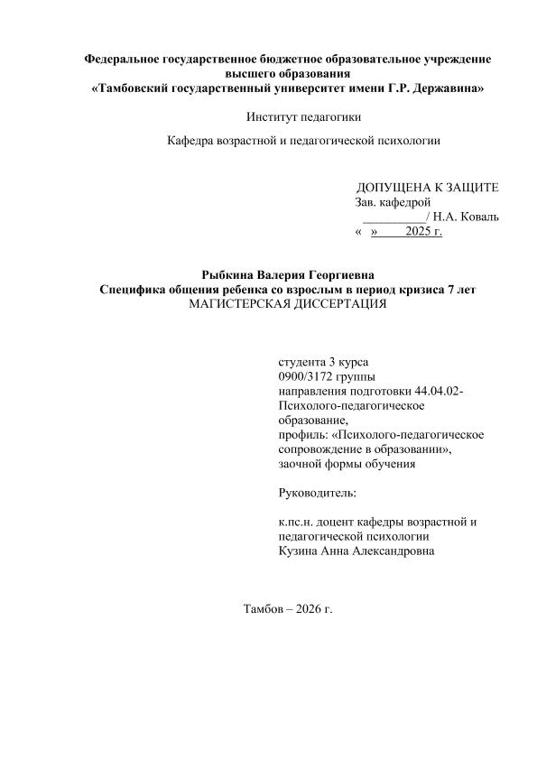 РЫБКИНА, ВАЛЕРИЯ ГЕОРГИЕВНА. СПЕЦИФИКА ОБЩЕНИЯ РЕБЕНКА СО ВЗРОСЛЫМ В ПЕРИОД КРИЗИСА 7 ЛЕТ [Электронный ресурс]: магистерская диссертация: 44.04.02 Психолого-педагогическое образование: Психолого-педагогическое сопровождение в образовании: Заочная форма обучения / В. Г. РЫБКИНА; ТГУ им. Г. Р. Державина ; науч. рук. к. пед. н., доцент, А. А. Кузина. — Электрон. текстовые дан. (1 файл). — Тамбов, 2025. — Загл. с титул. экрана. — <URL:https://elibrary.tsutmb.ru/dl/docs/vkr18906.pdf>.