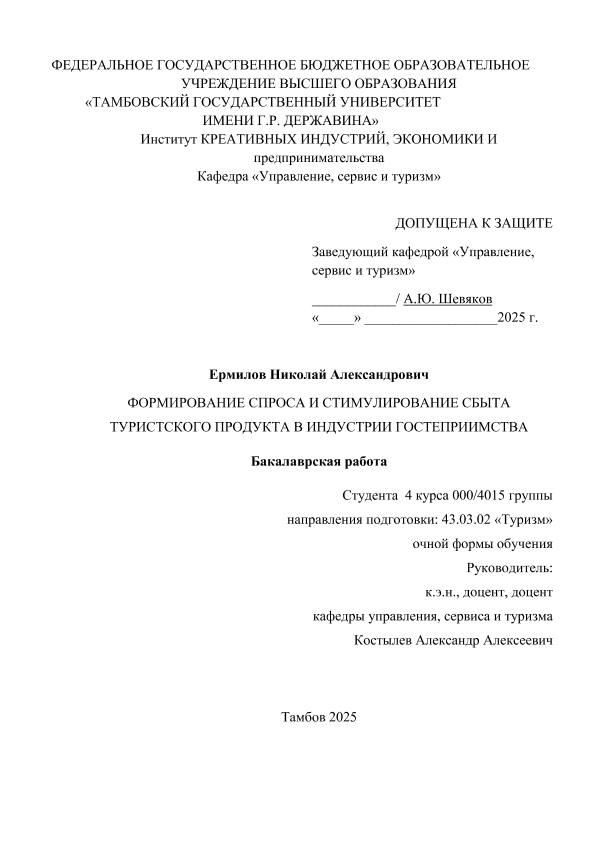 ЕРМИЛОВ, НИКОЛАЙ АЛЕКСАНДРОВИЧ. ФОРМИРОВАНИЕ СПРОСА И СТИМУЛИРОВАНИЕ СБЫТА ТУРИСТСКОГО ПРОДУКТА В ИНДУСТРИИ ГОСТЕПРИИМСТВА [Электронный ресурс]: бакалаврская работа: 43.03.02 Туризм: Очная форма обучения / Н. А. ЕРМИЛОВ; ТГУ им. Г. Р. Державина ; науч. рук., к. э. н., доцент А. А. Костылев. — Электрон. текстовые дан. (1 файл). — Тамбов, 2025. — Загл. с титул. экрана. — <URL:https://elibrary.tsutmb.ru/dl/docs/vkr18457.pdf>.