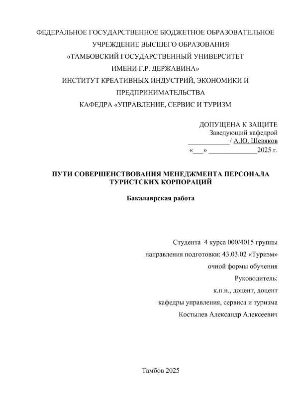 ЖДАНОВ, ОЛЕГ ИГОРЕВИЧ. ПУТИ СОВЕРШЕНСТВОВАНИЯ МЕНЕДЖМЕНТА ПЕРСОНАЛА ТУРИСТСКИХ КОРПОРАЦИЙ [Электронный ресурс]: бакалаврская работа: 43.03.02 Туризм: Очная форма обучения / О. И. ЖДАНОВ; ТГУ им. Г. Р. Державина ; науч. рук., к. э. н., доцент А. А. Костылев. — Электрон. текстовые дан. (1 файл). — Тамбов, 2025. — Загл. с титул. экрана. — <URL:https://elibrary.tsutmb.ru/dl/docs/vkr18458.pdf>.