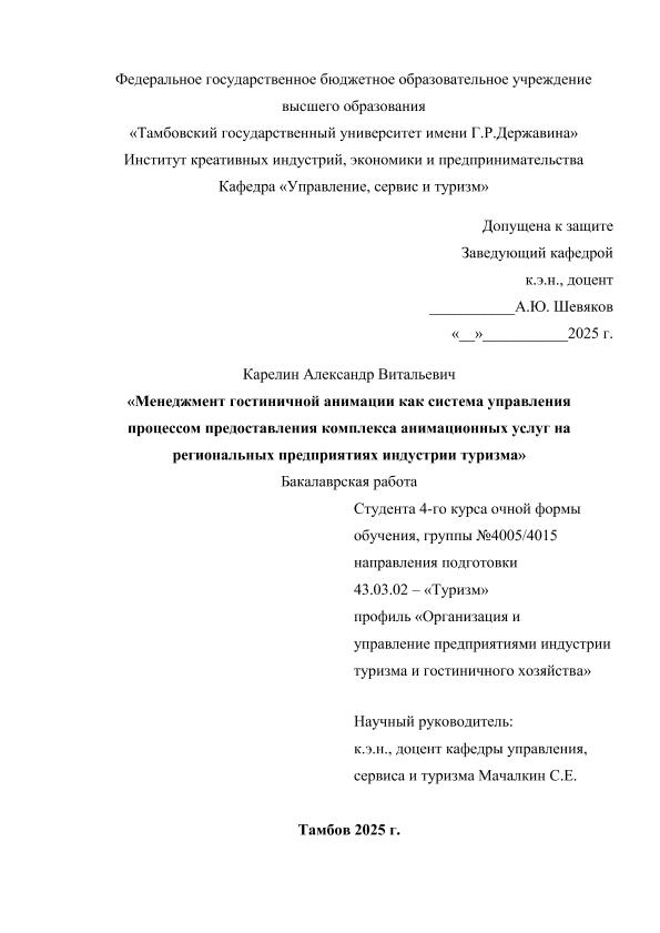 КАРЕЛИН, АЛЕКСАНДР ВИТАЛЬЕВИЧ. МЕНЕДЖМЕНТ ГОСТИНИЧНОЙ АНИМАЦИИ КАК СИСТЕМА УПРАВЛЕНИЯ ПРОЦЕССОМ ПРЕДОСТАВЛЕНИЯ КОМПЛЕКСА АНИМАЦИОННЫХ УСЛУГ НА РЕГИОНАЛЬНЫХ ПРЕДПРИЯТИЯХ ИНДУСТРИИ ТУРИЗМА [Электронный ресурс]: бакалаврская работа: 43.03.02 Туризм: Очная форма обучения / А. В. КАРЕЛИН; ТГУ им. Г. Р. Державина ; науч. рук., к. э. н., доцент С. Е. Мачалкин. — Электрон. текстовые дан. (1 файл). — Тамбов, 2025. — Загл. с титул. экрана. — <URL:https://elibrary.tsutmb.ru/dl/docs/vkr18459.pdf>.