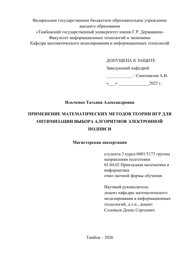 ИЛЬЧЕНКО, ТАТЬЯНА АЛЕКСАНДРОВНА. ПРИМЕНЕНИЕ МАТЕМАТИЧЕСКИХ МЕТОДОВ ТЕОРИИ ИГР ДЛЯ ОПТИМИЗАЦИИ ВЫБОРА АЛГОРИТМОВ ЭЛЕКТРОННОЙ ПОДПИСИ [Электронный ресурс]: магистерская диссертация: 01.04.02 Прикладная математика и информатика: Очно-заочная форма обучения / Т. А. ИЛЬЧЕНКО; ТГУ им. Г. Р. Державина ; науч. рук. к. т. н., доцент, Д. С. Соловьев. — Электрон. текстовые дан. (1 файл). — Тамбов, 2025. — Загл. с титул. экрана. — <URL:https://elibrary.tsutmb.ru/dl/docs/vkr18677.pdf>.