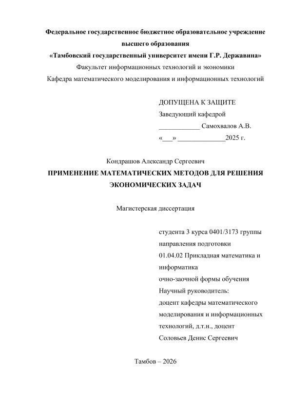 КОНДРАШОВ, АЛЕКСАНДР СЕРГЕЕВИЧ. ПРИМЕНЕНИЕ МАТЕМАТИЧЕСКИХ МЕТОДОВ ДЛЯ РЕШЕНИЯ ЭКОНОМИЧЕСКИХ ЗАДАЧ [Электронный ресурс]: магистерская диссертация: 01.04.02 Прикладная математика и информатика: Очно-заочная форма обучения / А. С. КОНДРАШОВ; ТГУ им. Г. Р. Державина ; науч. рук. к. т. н., доцент, Д. С. Соловьев. — Электрон. текстовые дан. (1 файл). — Тамбов, 2025. — Загл. с титул. экрана. — <URL:https://elibrary.tsutmb.ru/dl/docs/vkr18678.pdf>.