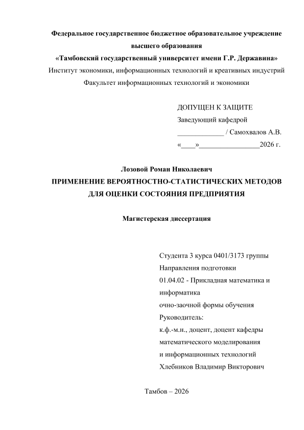 ЛОЗОВОЙ, РОМАН НИКОЛАЕВИЧ. ПРИМЕНЕНИЕ ВЕРОЯТНОСТНО-СТАТИСТИЧЕСКИХ МЕТОДОВ ДЛЯ ОЦЕНКИ СОСТОЯНИЯ ПРЕДПРИЯТИЯ [Электронный ресурс]: магистерская диссертация: 01.04.02 Прикладная математика и информатика: Очно-заочная форма обучения / Р. Н. ЛОЗОВОЙ; ТГУ им. Г. Р. Державина ; науч. рук. к. пед. н., доцент, В. В. Хлебников. — Электрон. текстовые дан. (1 файл). — Тамбов, 2025. — Загл. с титул. экрана. — <URL:https://elibrary.tsutmb.ru/dl/docs/vkr18680.pdf>.