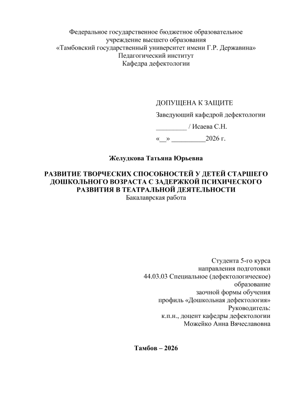 ЖЕЛУДКОВА, ТАТЬЯНА ЮРЬЕВНА. РАЗВИТИЕ ТВОРЧЕСКИХ СПОСОБНОСТЕЙ У ДЕТЕЙ СТАРШЕГО ДОШКОЛЬНОГО ВОЗРАСТА С ЗАДЕРЖКОЙ ПСИХИЧЕСКОГО РАЗВИТИЯ В ТЕАТРАЛЬНОЙ ДЕЯТЕЛЬНОСТИ [Электронный ресурс]: бакалаврская работа: 44.03.03 Специальное (дефектологическое) образование: Дошкольная дефектология: Заочная форма обучения / Т. Ю. ЖЕЛУДКОВА; ТГУ им. Г. Р. Державина ; науч. рук. к. пед. н., доцент, А. В. Можейко. — Электрон. текстовые дан. (1 файл). — Тамбов, 2025. — Загл. с титул. экрана. — <URL:https://elibrary.tsutmb.ru/dl/docs/vkr18719.pdf>.