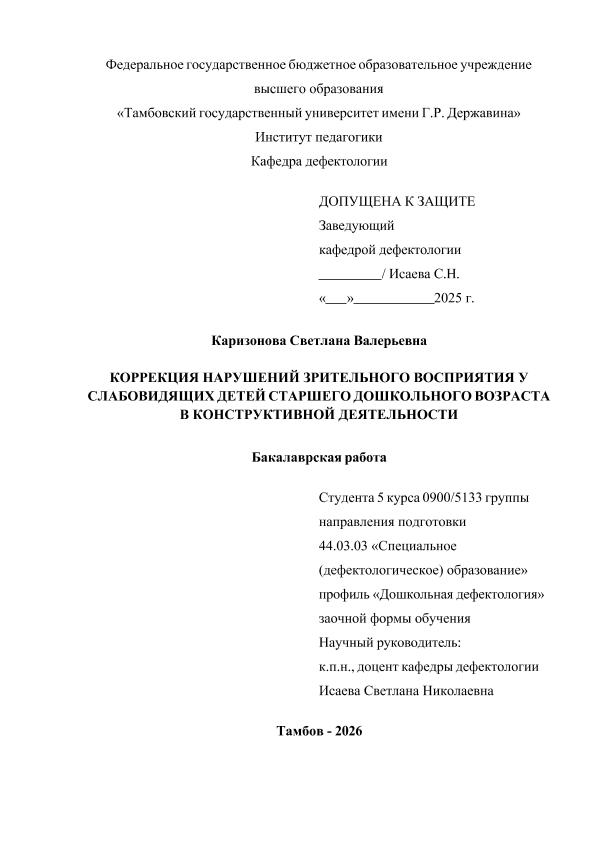 КАРИЗОНОВА, СВЕТЛАНА ВАЛЕРЬЕВНА. КОРРЕКЦИЯ НАРУШЕНИЙ ЗРИТЕЛЬНОГО ВОСПРИЯТИЯ У СЛАБОВИДЯЩИХ ДЕТЕЙ СТАРШЕГО ДОШКОЛЬНОГО ВОЗРАСТА В КОНСТРУКТИВНОЙ ДЕЯТЕЛЬНОСТИ [Электронный ресурс]: бакалаврская работа: 44.03.03 Специальное (дефектологическое) образование: Дошкольная дефектология: Заочная форма обучения / С. В. КАРИЗОНОВА; ТГУ им. Г. Р. Державина ; науч. рук. к. пед. н., доцент, С. Н. Исаева. — Электрон. текстовые дан. (1 файл). — Тамбов, 2025. — Загл. с титул. экрана. — <URL:https://elibrary.tsutmb.ru/dl/docs/vkr18720.pdf>.