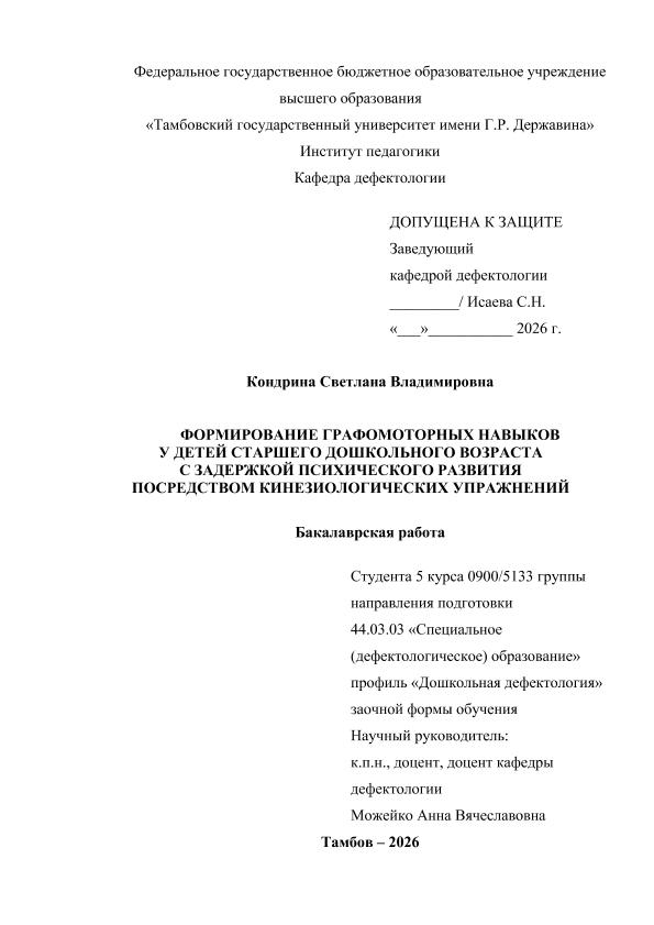 КОНДРИНА, СВЕТЛАНА ВЛАДИМИРОВНА. ФОРМИРОВАНИЕ ГРАФОМОТОРНЫХ НАВЫКОВ У ДЕТЕЙ СТАРШЕГО ДОШКОЛЬНОГО ВОЗРАСТА С ЗАДЕРЖКОЙ ПСИХИЧЕСКОГО РАЗВИТИЯ ПОСРЕДСТВОМ КИНЕЗИОЛОГИЧЕСКИХ УПРАЖНЕНИЙ [Электронный ресурс]: бакалаврская работа: 44.03.03 Специальное (дефектологическое) образование: Дошкольная дефектология: Заочная форма обучения / С. В. КОНДРИНА; ТГУ им. Г. Р. Державина ; науч. рук. к. пед. н., доцент, А. В. Можейко. — Электрон. текстовые дан. (1 файл). — Тамбов, 2025. — Загл. с титул. экрана. — <URL:https://elibrary.tsutmb.ru/dl/docs/vkr18721.pdf>.