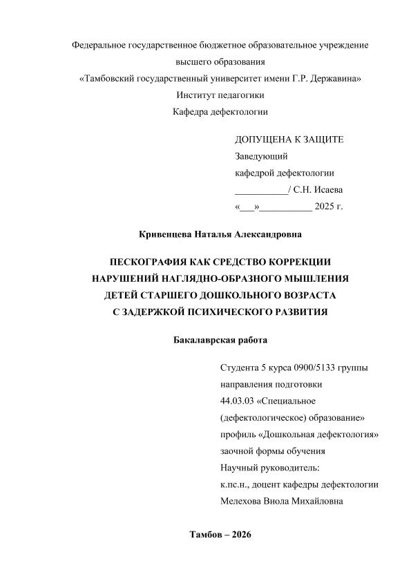 КРИВЕНЦЕВА, НАТАЛЬЯ АЛЕКСАНДРОВНА. ПЕСКОГРАФИЯ КАК СРЕДСТВО КОРРЕКЦИИ НАРУШЕНИЙ НАГЛЯДНО-ОБРАЗНОГО МЫШЛЕНИЯ ДЕТЕЙ СТАРШЕГО ДОШКОЛЬНОГО ВОЗРАСТА С ЗАДЕРЖКОЙ ПСИХИЧЕСКОГО РАЗВИТИЯ [Электронный ресурс]: бакалаврская работа: 44.03.03 Специальное (дефектологическое) образование: Дошкольная дефектология: Заочная форма обучения / Н. А. КРИВЕНЦЕВА; ТГУ им. Г. Р. Державина ; науч. рук. к. п. н, старший преподаватель, В. М. Мелехова. — Электрон. текстовые дан. (1 файл). — Тамбов, 2025. — Загл. с титул. экрана. — <URL:https://elibrary.tsutmb.ru/dl/docs/vkr18722.pdf>.