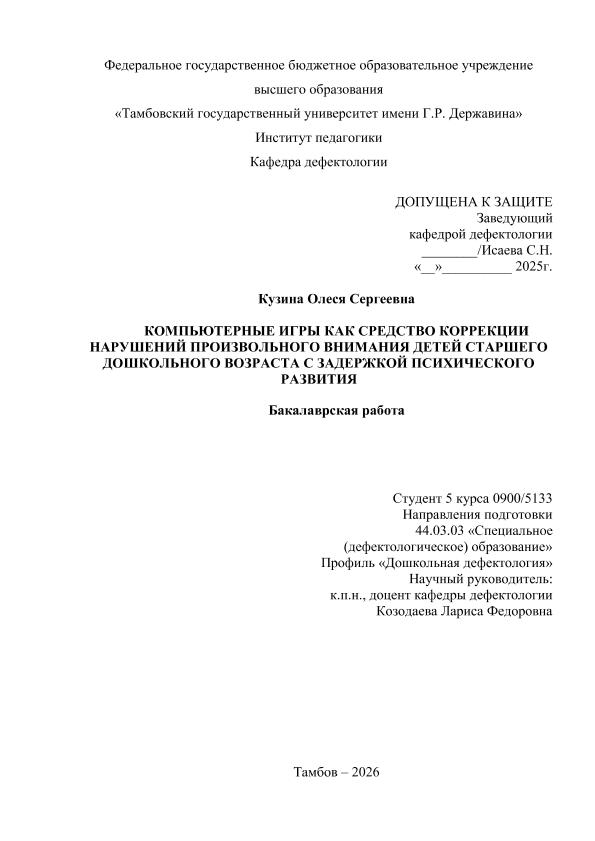 КУЗИНА, ОЛЕСЯ СЕРГЕЕВНА. КОМПЬЮТЕРНЫЕ ИГРЫ КАК СРЕДСТВО КОРРЕКЦИИ НАРУШЕНИЙ ПРОИЗВОЛЬНОГО ВНИМАНИЯ ДЕТЕЙ СТАРШЕГО ДОШКОЛЬНОГО ВОЗРАСТА С ЗАДЕРЖКОЙ ПСИХИЧЕСКОГО РАЗВИТИЯ [Электронный ресурс]: бакалаврская работа: 44.03.03 Специальное (дефектологическое) образование: Дошкольная дефектология: Заочная форма обучения / О. С. КУЗИНА; ТГУ им. Г. Р. Державина ; науч. рук. к. пед. н., доцент, Л. Ф. Козодаева. — Электрон. текстовые дан. (1 файл). — Тамбов, 2025. — Загл. с титул. экрана. — <URL:https://elibrary.tsutmb.ru/dl/docs/vkr18723.pdf>.