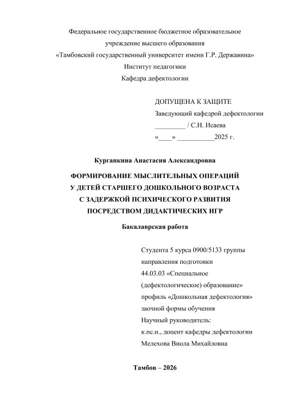КУРГАПКИНА, АНАСТАСИЯ АЛЕКСАНДРОВНА. ФОРМИРОВАНИЕ МЫСЛИТЕЛЬНЫХ ОПЕРАЦИЙ У ДЕТЕЙ СТАРШЕГО ДОШКОЛЬНОГО ВОЗРАСТА С ЗАДЕРЖКОЙ ПСИХИЧЕСКОГО РАЗВИТИЯ ПОСРЕДСТВОМ ДИДАКТИЧЕСКИХ ИГР [Электронный ресурс]: бакалаврская работа: 44.03.03 Специальное (дефектологическое) образование: Дошкольная дефектология: Заочная форма обучения / А. А. КУРГАПКИНА; ТГУ им. Г. Р. Державина ; науч. рук. к. п. н, старший преподаватель, В. М. Мелехова. — Электрон. текстовые дан. (1 файл). — Тамбов, 2025. — Загл. с титул. экрана. — <URL:https://elibrary.tsutmb.ru/dl/docs/vkr18724.pdf>.