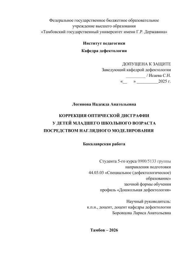 ЛОГИНОВА, НАДЕЖДА АНАТОЛЬЕВНА. КОРРЕКЦИЯ ОПТИЧЕСКОЙ ДИСГРАФИИ У ДЕТЕЙ МЛАДШЕГО ШКОЛЬНОГО ВОЗРАСТА ПОСРЕДСТВОМ НАГЛЯДНОГО МОДЕЛИРОВАНИЯ [Электронный ресурс]: бакалаврская работа: 44.03.03 Специальное (дефектологическое) образование: Дошкольная дефектология: Заочная форма обучения / Н. А. ЛОГИНОВА; ТГУ им. Г. Р. Державина ; науч. рук. к. пед. н., доцент, Л. А. Боровцова. — Электрон. текстовые дан. (1 файл). — Тамбов, 2025. — Загл. с титул. экрана. — <URL:https://elibrary.tsutmb.ru/dl/docs/vkr18726.pdf>.