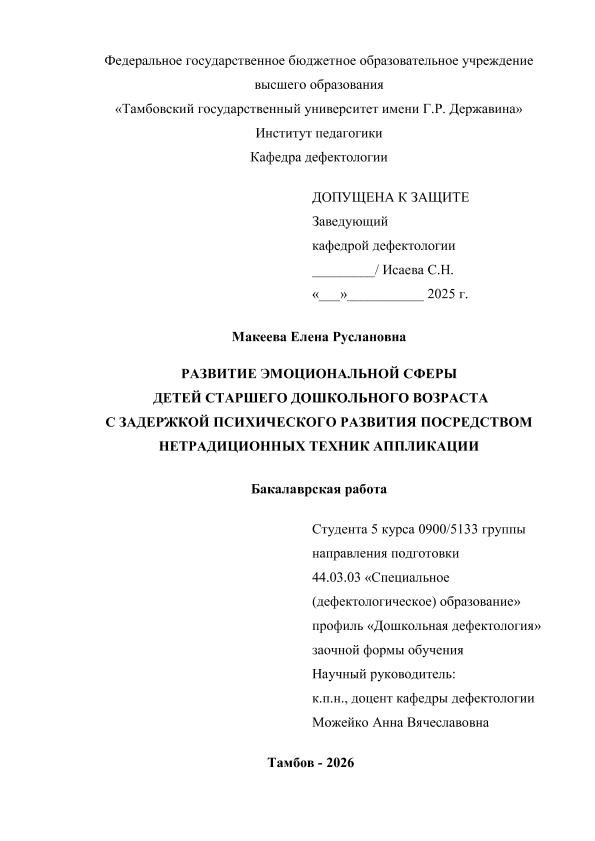 МАКЕЕВА, ЕЛЕНА РУСЛАНОВНА. РАЗВИТИЕ ЭМОЦИОНАЛЬНОЙ СФЕРЫ ДЕТЕЙ СТАРШЕГО ДОШКОЛЬНОГО ВОЗРАСТА С ЗАДЕРЖКОЙ ПСИХИЧЕСКОГО РАЗВИТИЯ ПОСРЕДСТВОМ НЕТРАДИЦИОННЫХ ТЕХНИК АППЛИКАЦИИ [Электронный ресурс]: бакалаврская работа: 44.03.03 Специальное (дефектологическое) образование: Дошкольная дефектология: Заочная форма обучения / Е. Р. МАКЕЕВА; ТГУ им. Г. Р. Державина ; науч. рук. к. пед. н., доцент, А. В. Можейко. — Электрон. текстовые дан. (1 файл). — Тамбов, 2025. — Загл. с титул. экрана. — <URL:https://elibrary.tsutmb.ru/dl/docs/vkr18728.pdf>.