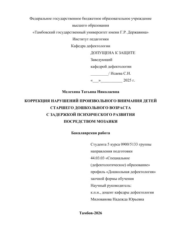 МЕЛЕХИНА, ТАТЬЯНА НИКОЛАЕВНА. КОРРЕКЦИЯ НАРУШЕНИЙ ПРОИЗВОЛЬНОГО ВНИМАНИЯ ДЕТЕЙ СТАРШЕГО ДОШКОЛЬНОГО ВОЗРАСТА С ЗАДЕРЖКОЙ ПСИХИЧЕСКОГО РАЗВИТИЯ ПОСРЕДСТВОМ МОЗАИКИ [Электронный ресурс]: бакалаврская работа: 44.03.03 Специальное (дефектологическое) образование: Дошкольная дефектология: Заочная форма обучения / Т. Н. МЕЛЕХИНА; ТГУ им. Г. Р. Державина ; науч. рук. к. п. н, доцент, Н. Ю. Милованова. — Электрон. текстовые дан. (1 файл). — Тамбов, 2025. — Загл. с титул. экрана. — <URL:https://elibrary.tsutmb.ru/dl/docs/vkr18729.pdf>.