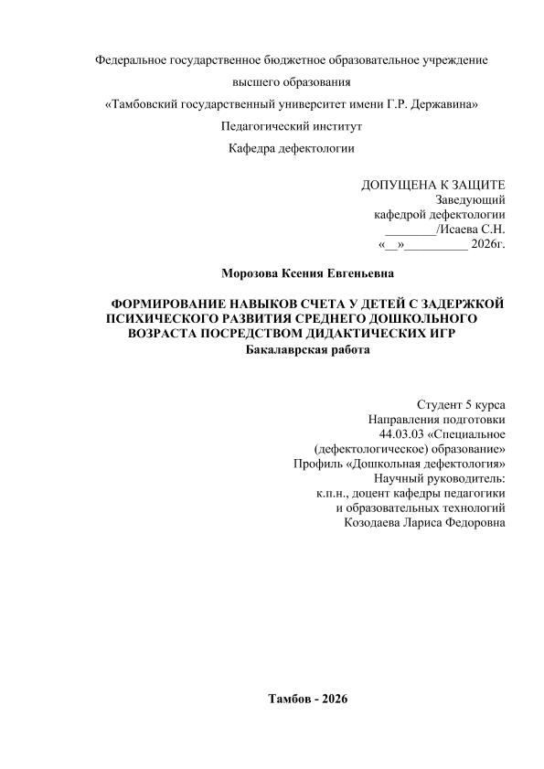 МОРОЗОВА, КСЕНИЯ ЕВГЕНЬЕВНА. ФОРМИРОВАНИЕ НАВЫКОВ СЧЕТА У ДЕТЕЙ С ЗАДЕРЖКОЙ ПСИХИЧЕСКОГО РАЗВИТИЯ СРЕДНЕГО ДОШКОЛЬНОГО ВОЗРАСТА ПОСРЕДСТВОМ ДИДАКТИЧЕСКИХ ИГР [Электронный ресурс]: бакалаврская работа: 44.03.03 Специальное (дефектологическое) образование: Дошкольная дефектология: Заочная форма обучения / К. Е. МОРОЗОВА; ТГУ им. Г. Р. Державина ; науч. рук. к. пед. н., доцент, Л. Ф. Козодаева. — Электрон. текстовые дан. (1 файл). — Тамбов, 2025. — Загл. с титул. экрана. — <URL:https://elibrary.tsutmb.ru/dl/docs/vkr18731.pdf>.