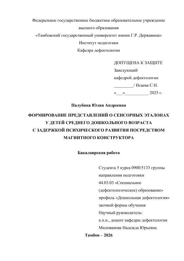 ПАЛУБИНА, ЮЛИЯ АНДРЕЕВНА. ФОРМИРОВАНИЕ ПРЕДСТАВЛЕНИЙ О СЕНСОРНЫХ ЭТАЛОНАХ У ДЕТЕЙ СРЕДНЕГО ДОШКОЛЬНОГО ВОЗРАСТА С ЗАДЕРЖКОЙ ПСИХИЧЕСКОГО РАЗВИТИЯ ПОСРЕДСТВОМ МАГНИТНОГО КОНСТРУКТОРА [Электронный ресурс]: бакалаврская работа: 44.03.03 Специальное (дефектологическое) образование: Дошкольная дефектология: Заочная форма обучения / Ю. А. ПАЛУБИНА; ТГУ им. Г. Р. Державина ; науч. рук. к. п. н, доцент, Н. Ю. Милованова. — Электрон. текстовые дан. (1 файл). — Тамбов, 2025. — Загл. с титул. экрана. — <URL:https://elibrary.tsutmb.ru/dl/docs/vkr18733.pdf>.