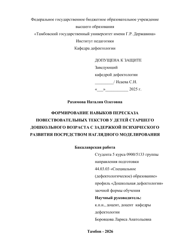 РАХИМОВА, НАТАЛИЯ ОЛЕГОВНА. ФОРМИРОВАНИЕ НАВЫКОВ ПЕРЕСКАЗА ПОВЕСТВОВАТЕЛЬНЫХ ТЕКСТОВ У ДЕТЕЙ СТАРШЕГО ДОШКОЛЬНОГО ВОЗРАСТА С ЗАДЕРЖКОЙ ПСИХИЧЕСКОГО РАЗВИТИЯ ПОСРЕДСТВОМ НАГЛЯДНОГО МОДЕЛИРОВАНИЯ [Электронный ресурс]: бакалаврская работа: 44.03.03 Специальное (дефектологическое) образование: Дошкольная дефектология: Заочная форма обучения / Н. О. РАХИМОВА; ТГУ им. Г. Р. Державина ; науч. рук. к. пед. н., доцент, Л. А. Боровцова. — Электрон. текстовые дан. (1 файл). — Тамбов, 2025. — Загл. с титул. экрана. — <URL:https://elibrary.tsutmb.ru/dl/docs/vkr18735.pdf>.