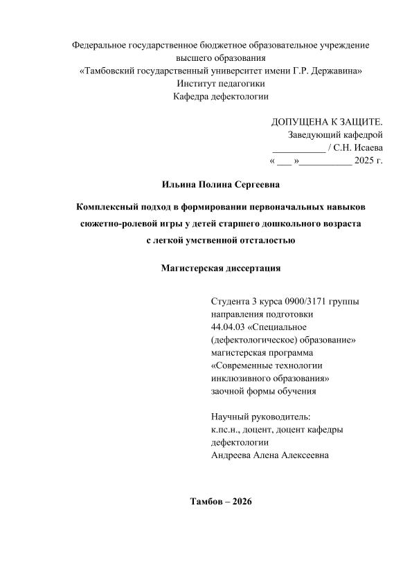 ИЛЬИНА, ПОЛИНА СЕРГЕЕВНА. КОМПЛЕКСНЫЙ ПОДХОД В ФОРМИРОВАНИИ ПЕРВОНАЧАЛЬНЫХ НАВЫКОВ СЮЖЕТНО-РОЛЕВОЙ ИГРЫ У ДЕТЕЙ СТАРШЕГО ДОШКОЛЬНОГО ВОЗРАСТА С ЛЕГКОЙ УМСТВЕННОЙ ОТСТАЛОСТЬЮ [Электронный ресурс]: магистерская диссертация: 44.04.03 Специальное (дефектологическое) образование: Современные технологии инклюзивного образования: Заочная форма обучения / П. С. ИЛЬИНА; ТГУ им. Г. Р. Державина ; науч. рук. к. п. н, доцент, А. А. Андреева. — Электрон. текстовые дан. (1 файл). — Тамбов, 2025. — Загл. с титул. экрана. — <URL:https://elibrary.tsutmb.ru/dl/docs/vkr18753.pdf>.