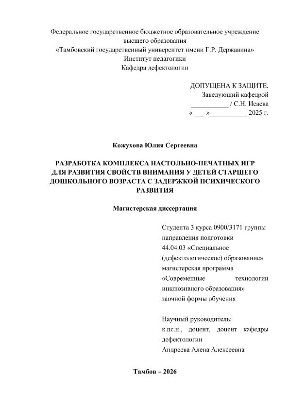 КОЖУХОВА, ЮЛИЯ СЕРГЕЕВНА. РАЗРАБОТКА КОМПЛЕКСА НАСТОЛЬНО-ПЕЧАТНЫХ ИГР ДЛЯ РАЗВИТИЯ СВОЙСТВ ВНИМАНИЯ У ДЕТЕЙ СТАРШЕГО ДОШКОЛЬНОГО ВОЗРАСТА С ЗАДЕРЖКОЙ ПСИХИЧЕСКОГО РАЗВИТИЯ [Электронный ресурс]: магистерская диссертация: 44.04.03 Специальное (дефектологическое) образование: Современные технологии инклюзивного образования: Заочная форма обучения / Ю. С. КОЖУХОВА; ТГУ им. Г. Р. Державина ; науч. рук. к. п. н, доцент, А. А. Андреева. — Электрон. текстовые дан. (1 файл). — Тамбов, 2025. — Загл. с титул. экрана. — <URL:https://elibrary.tsutmb.ru/dl/docs/vkr18754.pdf>.