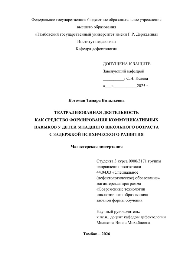 КОТОМАН, ТАМАРА ВИТАЛЬЕВНА. ТЕАТРАЛИЗОВАННАЯ ДЕЯТЕЛЬНОСТЬ КАК СРЕДСТВО ФОРМИРОВАНИЯ КОММУНИКАТИВНЫХ НАВЫКОВ У ДЕТЕЙ МЛАДШЕГО ШКОЛЬНОГО ВОЗРАСТА С ЗАДЕРЖКОЙ ПСИХИЧЕСКОГО РАЗВИТИЯ [Электронный ресурс]: магистерская диссертация: 44.04.03 Специальное (дефектологическое) образование: Современные технологии инклюзивного образования: Заочная форма обучения / Т. В. КОТОМАН; ТГУ им. Г. Р. Державина ; науч. рук. к. и. н., доцент, В. М. Мелехова. — Электрон. текстовые дан. (1 файл). — Тамбов, 2025. — Загл. с титул. экрана. — <URL:https://elibrary.tsutmb.ru/dl/docs/vkr18755.pdf>.