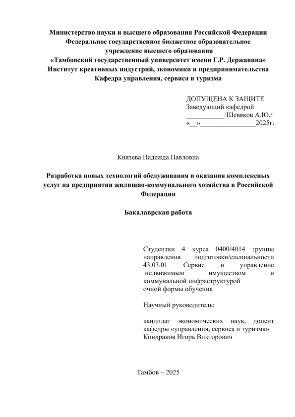 КНЯЗЕВА, НАДЕЖДА ПАВЛОВНА. РАЗРАБОТКА НОВЫХ ТЕХНОЛОГИЙ ОБСЛУЖИВАНИЯ И ОКАЗАНИЯ КОМПЛЕКСНЫХ УСЛУГ НА ПРЕДПРИЯТИИ ЖИЛИЩНО-КОММУНАЛЬНОГО ХОЗЯЙСТВА В РОССИЙСКОЙ ФЕДЕРАЦИИ [Электронный ресурс]: бакалаврская работа: 43.03.01 Сервис: Сервис и управление