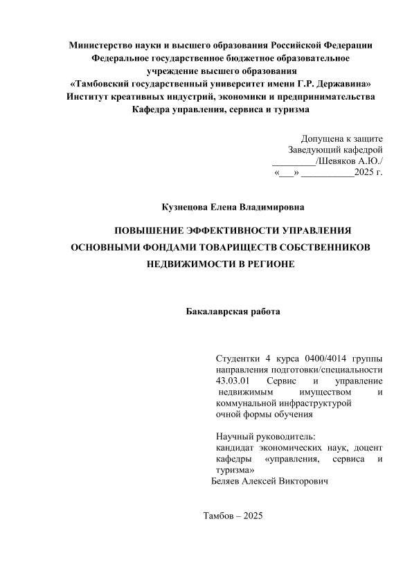 КУЗНЕЦОВА, ЕЛЕНА ВЛАДИМИРОВНА. ПОВЫШЕНИЕ ЭФФЕКТИВНОСТИ УПРАВЛЕНИЯ ОСНОВНЫМИ ФОНДАМИ ТОВАРИЩЕСТВ СОБСТВЕННОСТИ НЕДВИЖИМОСТИ В РЕГИОНЕ [Электронный ресурс]: бакалаврская работа: 43.03.01 Сервис: Сервис и управление