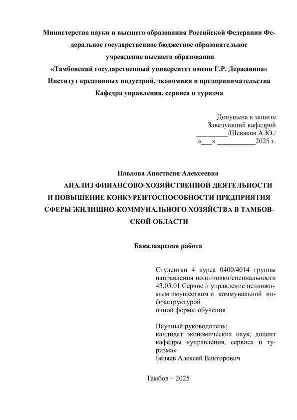 ПАВЛОВА, АНАСТАСИЯ АЛЕКСЕЕВНА. АНАЛИЗ ФИНАНСОВО-ХОЗЯЙСТВЕННОЙ ДЕЯТЕЛЬНОСТИ И ПОВЫШЕНИЕ КОНКУРЕНТНОСПОСОБНОСТИ ПРЕДПРИЯТИЯ СФЕРЫ ЖИЛИЩНО-КОМУНАЛЬНОГО ХОЗЯЙСТВА В ТАМБОВСКОЙ ОБЛАСТИ [Электронный ресурс]: бакалаврская работа: 43.03.01 Сервис: Сервис и управление