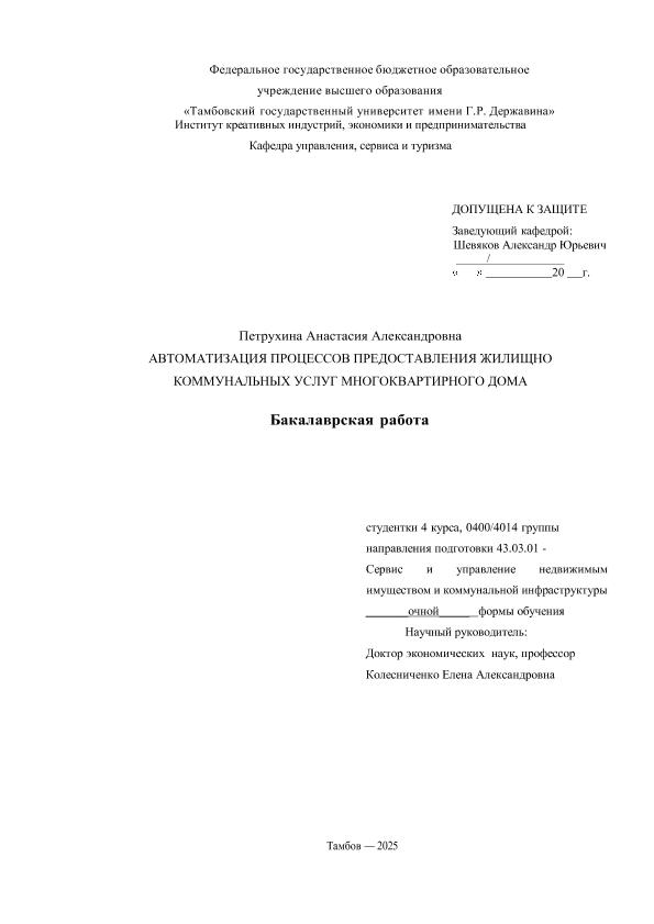коммунальной инфраструктурой: Очная форма обучения / А. А. ПЕТРУХИНА; ТГУ им. Г. Р. Державина ; науч. рук., к. э. н., доцент Е. А. Колесниченко. — Электрон. текстовые дан. (1 файл). — Тамбов, 2025. — Загл. с титул. экрана. — <URL:https://elibrary.tsutmb.ru/dl/docs/vkr18443.pdf>.