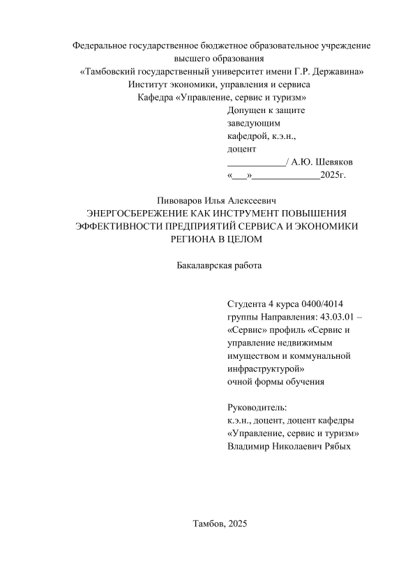 ПИВОВАРОВ, ИЛЬЯ АЛЕКСЕЕВИЧ. ЭНЕРГОСБЕРЕЖЕНИЕ КАК ИНСТРУМЕНТ ПОВЫШЕНИЯ ЭФФЕКТИВНОСТИ ПРЕДПРИЯТИЙ СЕРВИСА И ЭКОНОМИКИ РЕГИОНА В ЦЕЛОМ [Электронный ресурс]: бакалаврская работа: 43.03.01 Сервис: Сервис и управление