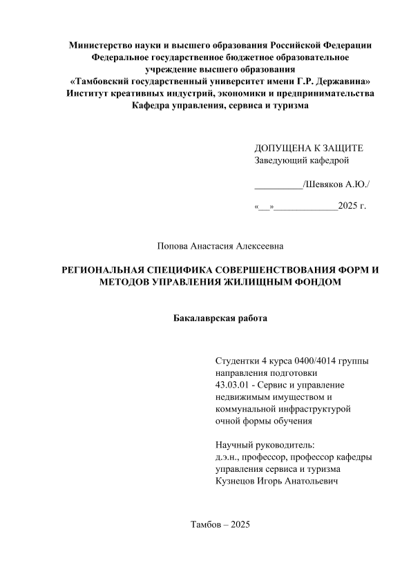 ПОПОВА, АНАСТАСИЯ АЛЕКСЕЕВНА. РЕГИОНАЛЬНАЯ СПЕЦИФИКА СОВЕРШЕНСТВОВАНИЯ ФОРМ И МЕТОДОВ УПРАВЛЕНИЯ ЖИЛИЩНЫМ ФОНДОМ [Электронный ресурс]: бакалаврская работа: 43.03.01 Сервис: Сервис и управление