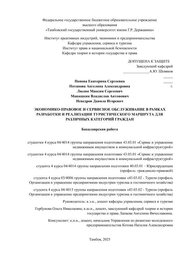 ПОПОВА, ЕКАТЕРИНА СЕРГЕЕВНА. ЭКОНОМИКО-ПРАВОВОЕ И СЕРВИСНОЕ ОБСЛУЖИВАНИЕ В РАМКАХ РАЗРАБОТКИ И РЕАЛИЗАЦИИ ТУРИСТИЧЕСКОГО МАРШРУТА ДЛЯ РАЗЛИЧНЫХ КАТЕГОРИЙ ГРАЖДАН [Электронный ресурс]: бакалаврская работа: 43.03.01 Сервис: Сервис и управление