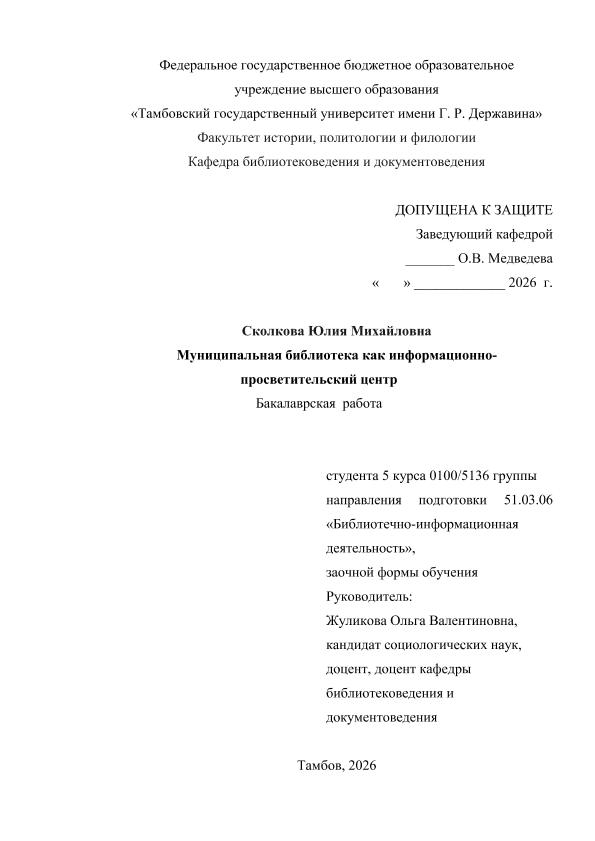СКОЛКОВА, ЮЛИЯ МИХАЙЛОВНА. МУНИЦИПАЛЬНАЯ БИБЛИОТЕКА КАК ИНФОРМАЦИОННО- ПРОСВЕТИТЕЛЬСКИЙ ЦЕНТР [Электронный ресурс]: бакалаврская работа: 51.03.06 Библиотечно-информационная деятельность: Заочная форма обучения / Ю. М. СКОЛКОВА; ТГУ им. Г. Р. Державина ; науч. рук. к. социол. н., доцент, О. В. Жуликова. — Электрон. текстовые дан. (1 файл). — Тамбов, 2026. — Загл. с титул. экрана. — <URL:https://elibrary.tsutmb.ru/dl/docs/vkr18847.pdf>.