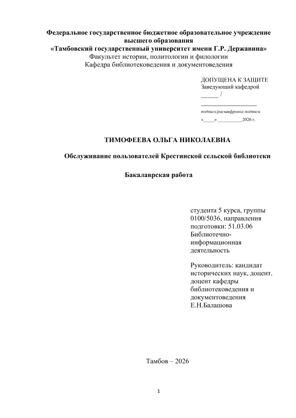ТИМОФЕЕВА, ОЛЬГА НИКОЛАЕВНА. ОБСЛУЖИВАНИЕ ПОЛЬЗОВАТЕЛЕЙ КРЕСТИНСКОЙ СЕЛЬСКОЙ БИБЛИОТЕКИ [Электронный ресурс]: бакалаврская работа: 51.03.06 Библиотечно-информационная деятельность: Заочная форма обучения / О. Н. ТИМОФЕЕВА; ТГУ им. Г. Р. Державина ; науч. рук. к. и. н., доцент, Е. Н. Балашова. — Электрон. текстовые дан. (1 файл). — Тамбов, 2026. — Загл. с титул. экрана. — <URL:https://elibrary.tsutmb.ru/dl/docs/vkr18848.pdf>.