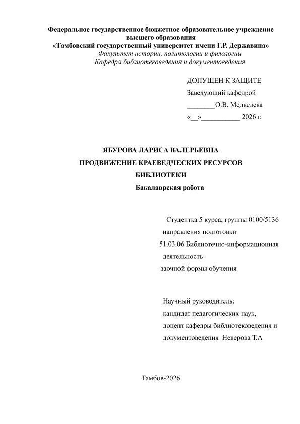 ЯБУРОВА, ЛАРИСА ВАЛЕРЬЕВНА. ПРОДВИЖЕНИЕ КРАЕВЕДЧЕСКИХ РЕСУРСОВ БИБЛИОТЕКИ [Электронный ресурс]: бакалаврская работа: 51.03.06 Библиотечно-информационная деятельность: Заочная форма обучения / Л. В. ЯБУРОВА; ТГУ им. Г. Р. Державина ; науч. рук. к. пед. н., доцент, Т. А. Неверова. — Электрон. текстовые дан. (1 файл). — Тамбов, 2026. — Загл. с титул. экрана. — <URL:https://elibrary.tsutmb.ru/dl/docs/vkr18849.pdf>.