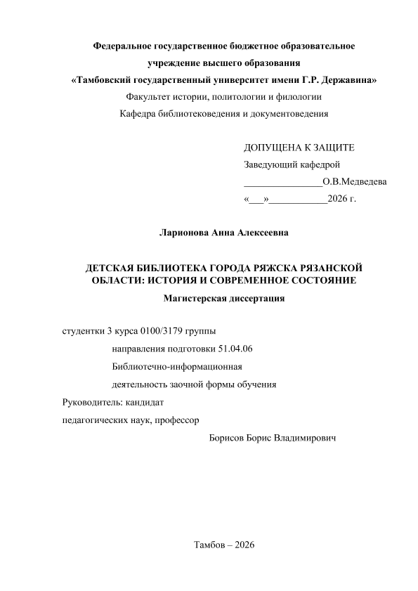ЛАРИОНОВА, АННА АЛЕКСЕЕВНА. ДЕТСКАЯ БИБЛИОТЕКА ГОРОДА РЯЖСКА РЯЗАНСКОЙ ОБЛАСТИ: ИСТОРИЯ И СОВРЕМЕННОЕ СОСТОЯНИЕ [Электронный ресурс]: магистерская диссертация: 51.04.06 Библиотечно-информационная деятельности: Заочная форма обучения / А. А. ЛАРИОНОВА; ТГУ им. Г. Р. Державина ; науч. рук. к. пед. н., профессор, Б. В. Борисов. — Электрон. текстовые дан. (1 файл). — Тамбов, 2026. — Загл. с титул. экрана. — <URL:https://elibrary.tsutmb.ru/dl/docs/vkr18850.pdf>.