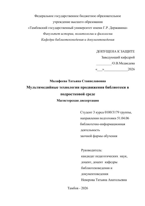 МАЛАФЕЕВА, ТАТЬЯНА СТАНИСЛАВОВНА. МУЛЬТИМЕДИЙНЫЕ ТЕХНОЛОГИИ ПРОДВИЖЕНИЯ БИБЛИОТЕКИ В ПОДРОСТКОВОЙ СРЕДЕ [Электронный ресурс]: магистерская диссертация: 51.04.06 Библиотечно-информационная деятельности: Заочная форма обучения / Т. С. МАЛАФЕЕВА; ТГУ им. Г. Р. Державина ; науч. рук. к. пед. н., доцент, Т. А. Неверова. — Электрон. текстовые дан. (1 файл). — Тамбов, 2026. — Загл. с титул. экрана. — <URL:https://elibrary.tsutmb.ru/dl/docs/vkr18851.pdf>.
