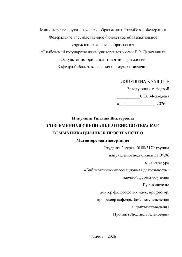 НИКУЛИНА, ТАТЬЯНА ВИКТОРОВНА. СОВРЕМЕННАЯ СПЕЦИАЛЬНАЯ БИБЛИОТЕКА КАК КОММУНИКАЦИОННОЕ ПРОСТРАНСТВО [Электронный ресурс]: магистерская диссертация: 51.04.06 Библиотечно-информационная деятельности: Заочная форма обучения / Т. В. НИКУЛИНА; ТГУ им. Г. Р. Державина ; науч. рук. д. филос. н., профессор, Л. А. Пронина. — Электрон. текстовые дан. (1 файл). — Тамбов, 2026. — Загл. с титул. экрана. — <URL:https://elibrary.tsutmb.ru/dl/docs/vkr18852.pdf>.