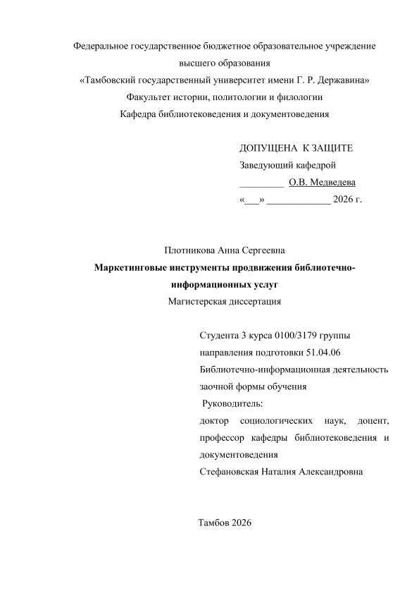 ПЛОТНИКОВА, АННА СЕРГЕЕВНА. МАРКЕТИНГОВЫЕ ИНСТРУМЕНТЫ ПРОДВИЖЕНИЯ БИБЛИОТЕЧНО- ИНФОРМАЦИОННЫХ УСЛУГ [Электронный ресурс]: магистерская диссертация: 51.04.06 Библиотечно-информационная деятельности: Заочная форма обучения / А. С. ПЛОТНИКОВА; ТГУ им. Г. Р. Державина ; науч. рук. д. социол. н., профессор, Н. А. Стефановская. — Электрон. текстовые дан. (1 файл). — Тамбов, 2026. — Загл. с титул. экрана. — <URL:https://elibrary.tsutmb.ru/dl/docs/vkr18853.pdf>.