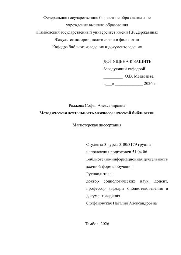 РОЖКОВА, СОФЬЯ АЛЕКСАНДРОВНА. МЕТОДИЧЕСКАЯ ДЕЯТЕЛЬНОСТЬ МЕЖПОСЕЛЕНЧЕСКОЙ БИБЛИОТЕКИ [Электронный ресурс]: магистерская диссертация: 51.04.06 Библиотечно-информационная деятельности: Заочная форма обучения / С. А. РОЖКОВА; ТГУ им. Г. Р. Державина ; науч. рук. д. социол. н., профессор, Н. А. Стефановская. — Электрон. текстовые дан. (1 файл). — Тамбов, 2026. — Загл. с титул. экрана. — <URL:https://elibrary.tsutmb.ru/dl/docs/vkr18854.pdf>.