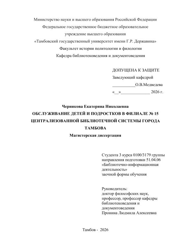 ЧЕРНИКОВА, ЕКАТЕРИНА НИКОЛАЕВНА. ОБСЛУЖИВАНИЕ ДЕТЕЙ И ПОДРОСТКОВ В ФИЛИАЛЕ № 15 ЦЕНТРАЛИЗОВАННОЙ БИБЛИОТЕЧНОЙ СИСТЕМЫ ГОРОДА ТАМБОВА [Электронный ресурс]: магистерская диссертация: 51.04.06 Библиотечно-информационная деятельности: Заочная форма обучения / Е. Н. ЧЕРНИКОВА; ТГУ им. Г. Р. Державина ; науч. рук. д. филос. н., профессор, Л. А. Пронина. — Электрон. текстовые дан. (1 файл). — Тамбов, 2026. — Загл. с титул. экрана. — <URL:https://elibrary.tsutmb.ru/dl/docs/vkr18855.pdf>.