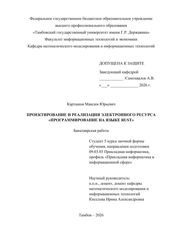 КАРТАШОВ, МАКСИМ ЮРЬЕВИЧ. ПРОЕКТИРОВАНИЕ И РЕАЛИЗАЦИЯ ЭЛЕКТРОННОГО РЕСУРСА «ПРОГРАММИРОВАНИЕ НА ЯЗЫКЕ RUST» [Электронный ресурс]: бакалаврская работа: 09.03.03 Прикладная информатика: Прикладная информатика в информационной сфере: Заочная форма обучения / М. Ю. КАРТАШОВ; ТГУ им. Г. Р. Державина ; науч. рук. к. пед. н., доцент, И. А. Киселева. — Электрон. текстовые дан. (1 файл). — Тамбов, 2026. — Загл. с титул. экрана. — <URL:https://elibrary.tsutmb.ru/dl/docs/vkr19116.pdf>.